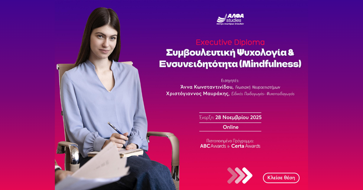 Συμβουλευτική Ψυχολογία & Mindfulness», το οποίο παρέχεται online (και με video on demand) και διαρκεί 1 ακαδημαϊκό έτος με έναρξη στις 28 Νοεμβρίου.