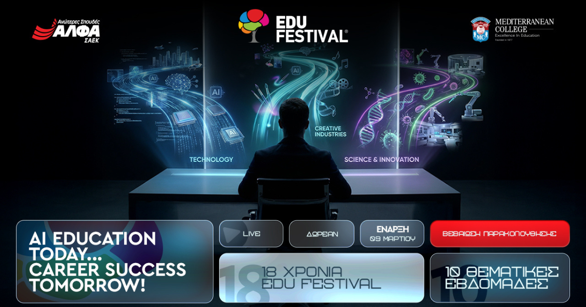 “Α.Ι. your Education & Career” λοιπόν @EDUFESTIVAL από τις 9 Μαρτίου έως και τις 29 Μαΐου, με 10 Θεματικές Εβδομάδες που θα ξεπεράσουν κάθε εκπαιδευτική προσδοκία!