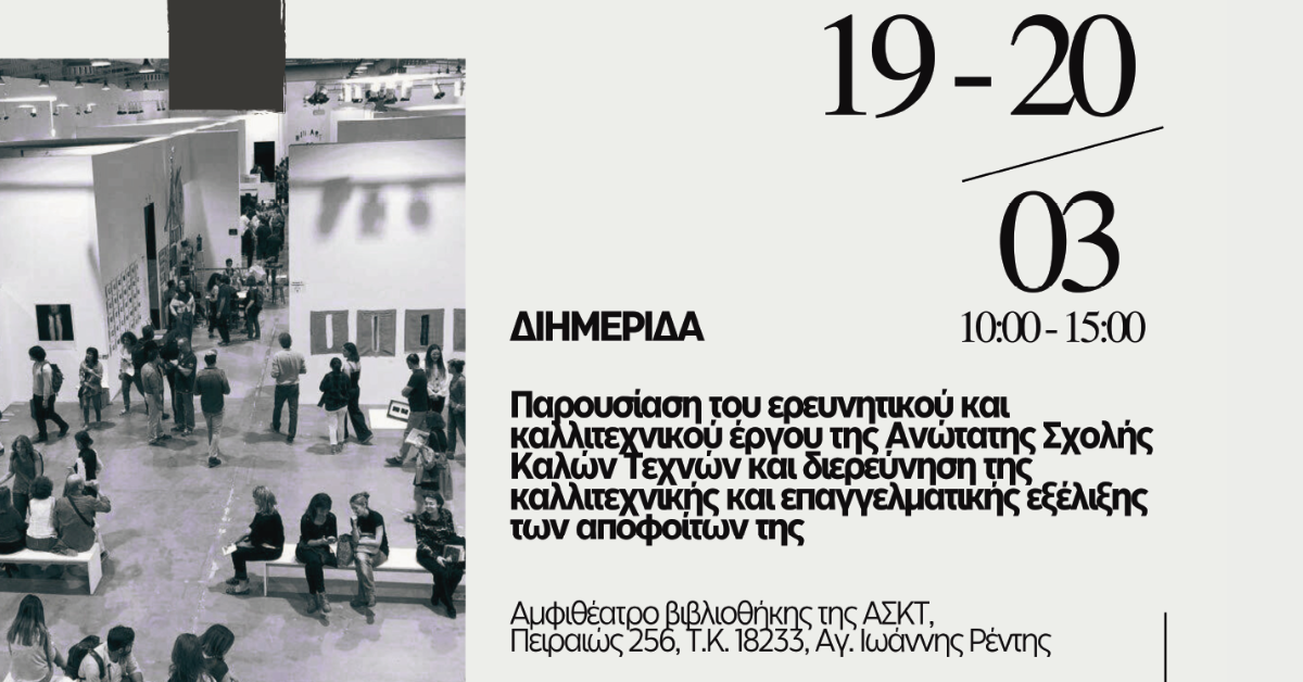Διημερίδα «Στρατηγική Αριστεία της Ανώτατης Σχολής Καλών Τεχνών – Ανάπτυξη Κέντρου Καινοτομίας / Επιχειρηματικότητας» στην ΑΣΚΤ |19 – 20 Μαρτίου 2026 | 10:00 – 15:00 | Αμφιθέατρο Βιβλιοθήκης ΑΣΚΤ