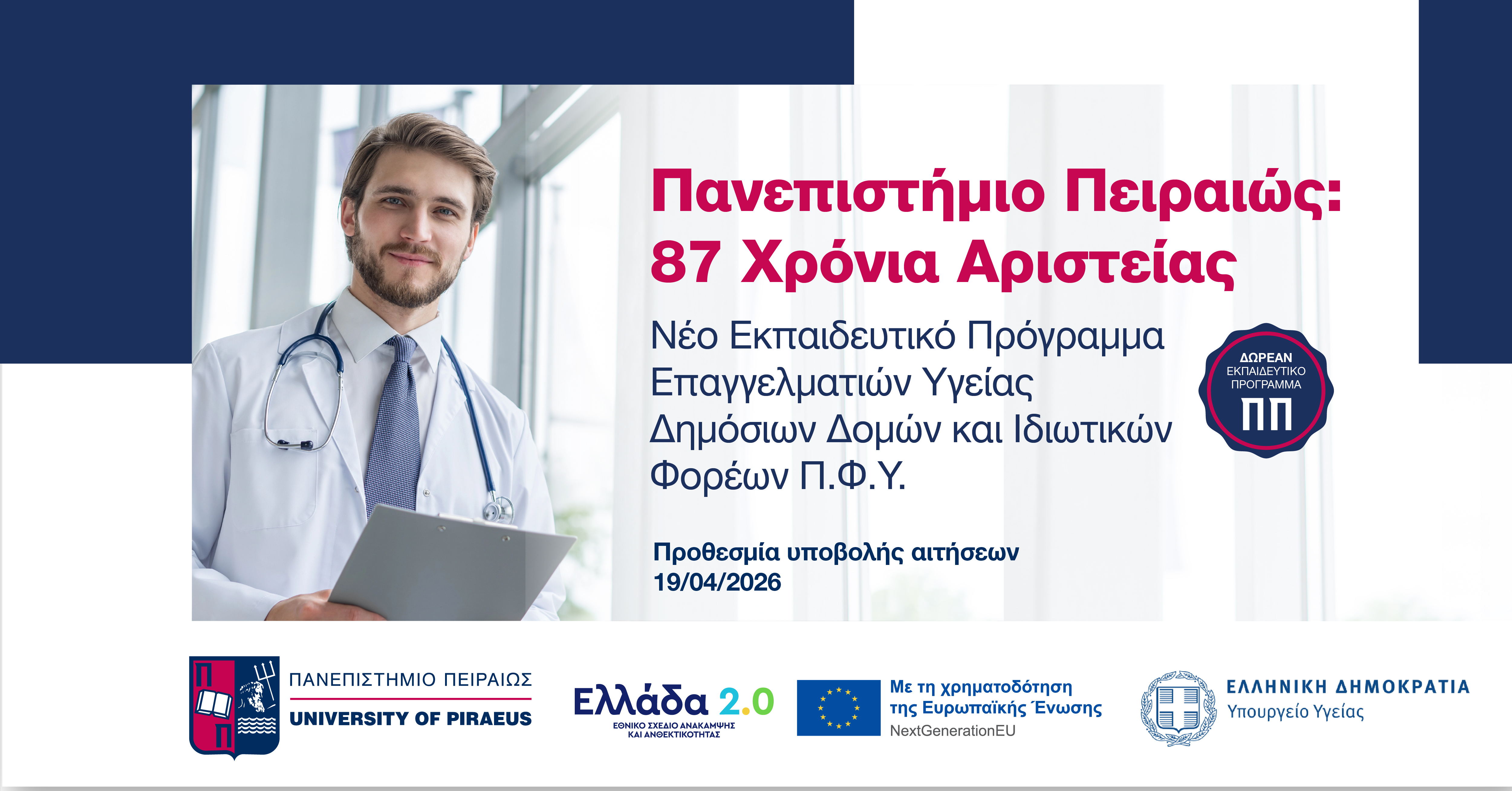 Το Πανεπιστήμιο Πειραιώς, πιστό στην αποστολή του ως πυλώνας αριστείας από το 1938, ενώνει τις δυνάμεις του με το Υπουργείο Υγείας για την υλοποίηση μιας εθνικής προσπάθειας θωράκισης του έμψυχου δυναμικού της Δημόσιας και Ιδιωτικής Υγείας. Μέσω του Κέντρου Επιμόρφωσης και Δια Βίου Μάθησης (ΚΕΔΙΒΙΜ), το Πανεπιστήμιο προσφέρει δωρεάν, πιστοποιημένα εξ αποστάσεως προγράμματα επιμόρφωσης, σχεδιασμένα να ανταποκρίνονται στις σύγχρονες απαιτήσεις του ψηφιακού και διοικητικού μετασχηματισμού.