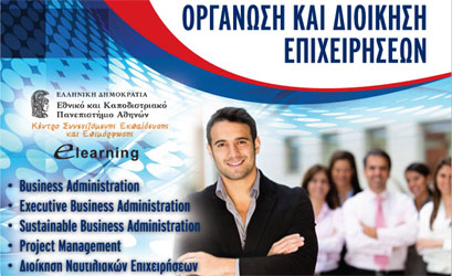 Το e-learning του Κέντρου Συνεχιζόμενης Εκπαίδευσης και Επιμόρφωσης του Εθνικού και Καποδιστριακού Πανεπιστημίου Αθηνών (ΕΚΠΑ) διαθέτει ένα πλήθος προγραμμάτων εξ αποστάσεως εκπαίδευσης στην Κατεύθυνση της Οργάνωσης και Διοίκησης Επιχειρήσεων. Οι ενδιαφερόμενοι μπορούν να υποβάλλουν την αίτησή τους έως τις 14/2/2014 στα ακόλουθα προγράμματα διάρκειας από 5 έως 9 μήνες που είναι διαθέσιμα στον τρέχοντα κύκλο σπουδών: