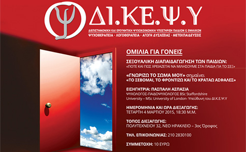 Στις 4 Μαρτίου 2015 και ώρα 18:30 μ.μ, η Ψυχολόγος, Παιδοψυχολόγος, Πασπάλη Ασπασία, Υπεύθυνη του ΔΙ.Κ.Ε.Ψ.Υ παρουσιάζει το θέμα με τίτλο «Σεξουαλική Διαπαιδαγώγηση των παιδιών. Πότε και πως χρειάζεται να μιλήσουμε στα παιδιά για το σεξ;» σε μια ανοιχτή ομιλία με γονείς παιδιών προσχολικής και σχολικής ηλικίας.