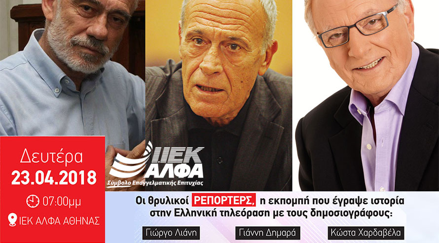 Μπορεί στην ελληνική τηλεόραση, όπου κυριαρχεί το εφήμερο, το εύπεπτο και οι εκπομπές lifestyle και gossip, να επιζήσει -και μάλιστα να μακροημερεύσει- μια αμιγώς δημοσιογραφική και ειδησεογραφική εκπομπή; Το παράδειγμα της θρυλικής εκπομπής «ΡΕΠΟΡΤΕΡΣ» αποδεικνύει περίτρανα πως γίνεται και η δημοσιογραφική τριάδα των διακεκριμένων «ΡΕΠΟΡΤΕΡΣ» Γιώργου Λιάνη, Γιάννη Δημαρά και Κώστα Χαρδαβέλλα, θα βρεθούν τη Δευτέρα 23 Απριλίου στις 19.00 στο ΙΕΚ ΑΛΦΑ Αθήνας, για να αποκαλύψουν τη συνταγή της επιτυχίας.