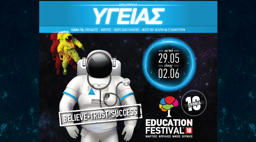 Μετά από ένα 9ετές ταξίδι δωρεάν εκπαίδευσης γεμάτο πολύτιμες γνώσεις και εμπειρίες, το ΕDUCATION FESTIVAL, το μεγαλύτερο εκπαιδευτικό φεστιβάλ σε Ελλάδα και Ευρώπη, «κλείνει» φέτος 10 χρόνια και με άξονα το «BELIEVE+TRUST=SUCCESS» των εκπαιδευτικών φορέων ΙΕΚ ΑΛΦΑ και MEDITERRANEAN COLLEGE ανακοινώνει την έναρξη της 11ης εβδομάδας δωρεάν σεμιναρίων, που είναι αφιερωμένη στα επαγγέλματα και τις σπουδές Υγείας.